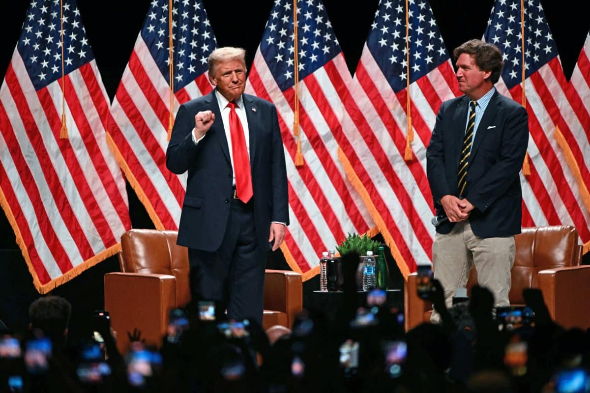 Former President Donald Trump arrives for a live interview wit commentator Tucker Carlson during the finale of the Tucker Carlson Live Tour at Desert Diamond Arena in Glendale, Arizona, on Oct. 31.