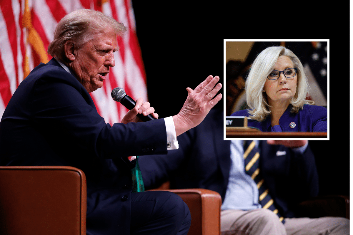 Republican presidential nominee, former President Donald Trump sits down for a conversation with Tucker Carlson during his Live Tour at the Desert Diamond Arena on October 31, 2024 in Phoenix, Arizona. Inset of Liz Cheney participating in the last public meeting in the Canon House Office Building on Capitol Hill on December 19, 2022 in Washington, DC.