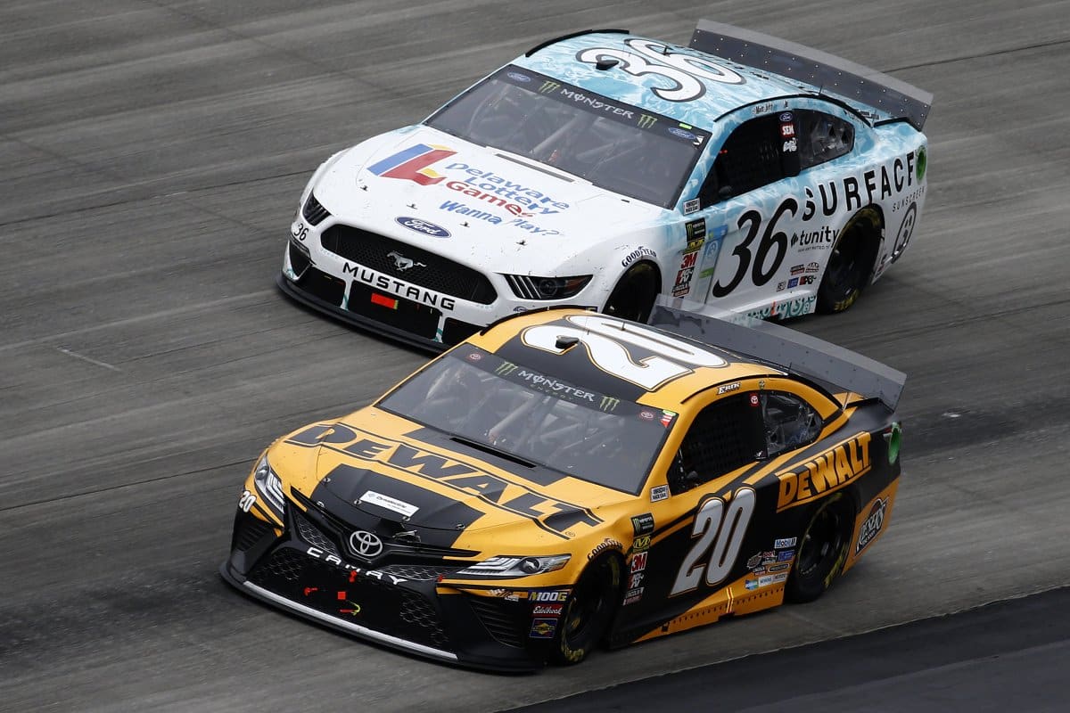 Erik Jones, driver of the #20 DeWalt Toyota, leads Matt Tifft, driver of the #36 Delaware Lottery/Surface Ford, during the Monster Energy NASCAR Cup Series Drydene 400 at Dover International Speedway on October 06, 2019 in Dover, Delaware. Matt Tifft considers legal action after brutal attack.