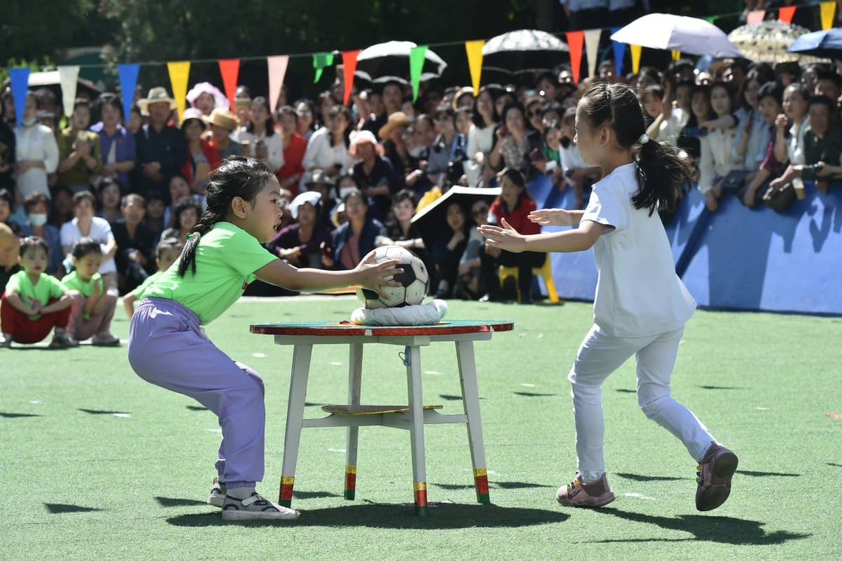 Children play games at the Changgwang Kindergarten in Pyongyang on June 1 to mark North Korea’s Children’s Day.