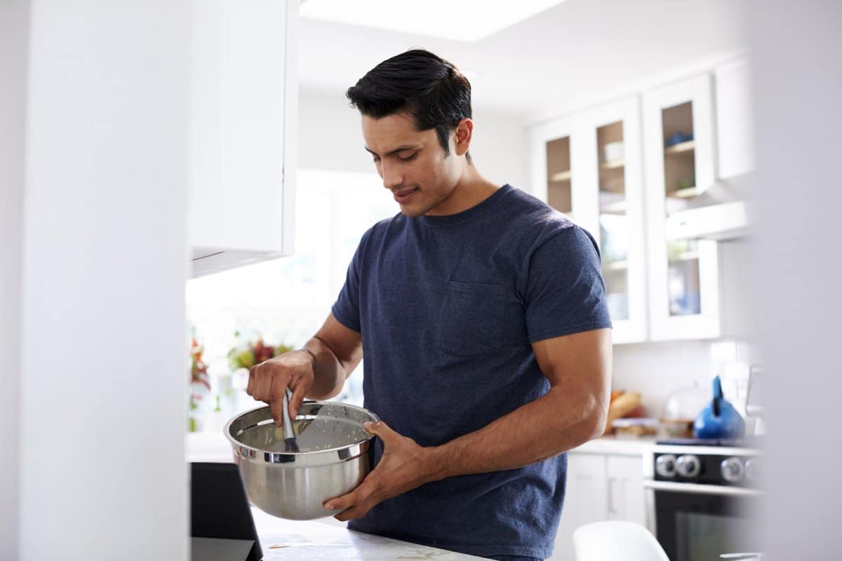 A man stirs cake mix in his kitchen. A video on TikTok has gone viral after a woman’s husband made a crucial mistake while making brownies.