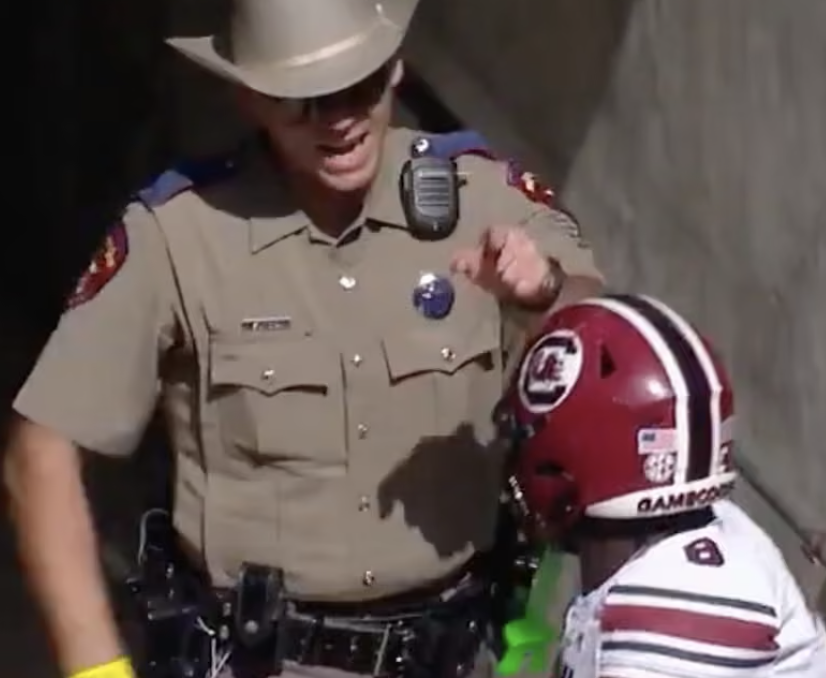 College football is supposed to be a celebration of youthful energy, community pride, and the kind of ritual that binds generations together. The stadium lights, the marching band, the roar of the crowd—all of it creates a spectacle that transcends the game itself. But when law enforcement officers decide to insert themselves into that spectacle not as guardians but as aggressors, the ritual collapses into something darker. Last Saturday, under the glare of stadium lights and the expectant hum of a college crowd, a Texas Department of Public Safety trooper delivered a hit that belonged on a defensive highlight reel, not in a police report. His targets were South Carolina’s Nyck Harbor, fresh off an 80-yard touchdown, and his teammate Oscar Adaway III. The trooper, elbow extended, made deliberate contact with the players as they passed through the tunnel, then turned to scold them as if celebration itself were a crime.