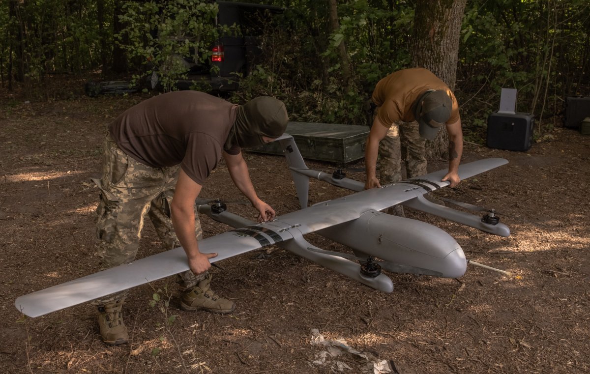 This illustrative image shows Ukrainian military drone operators in the Sumy region, near the border with Russia, on August 11, 2024. Debris from 20 drones have landed in NATO territory according an assessment by independent outlet Verstka.