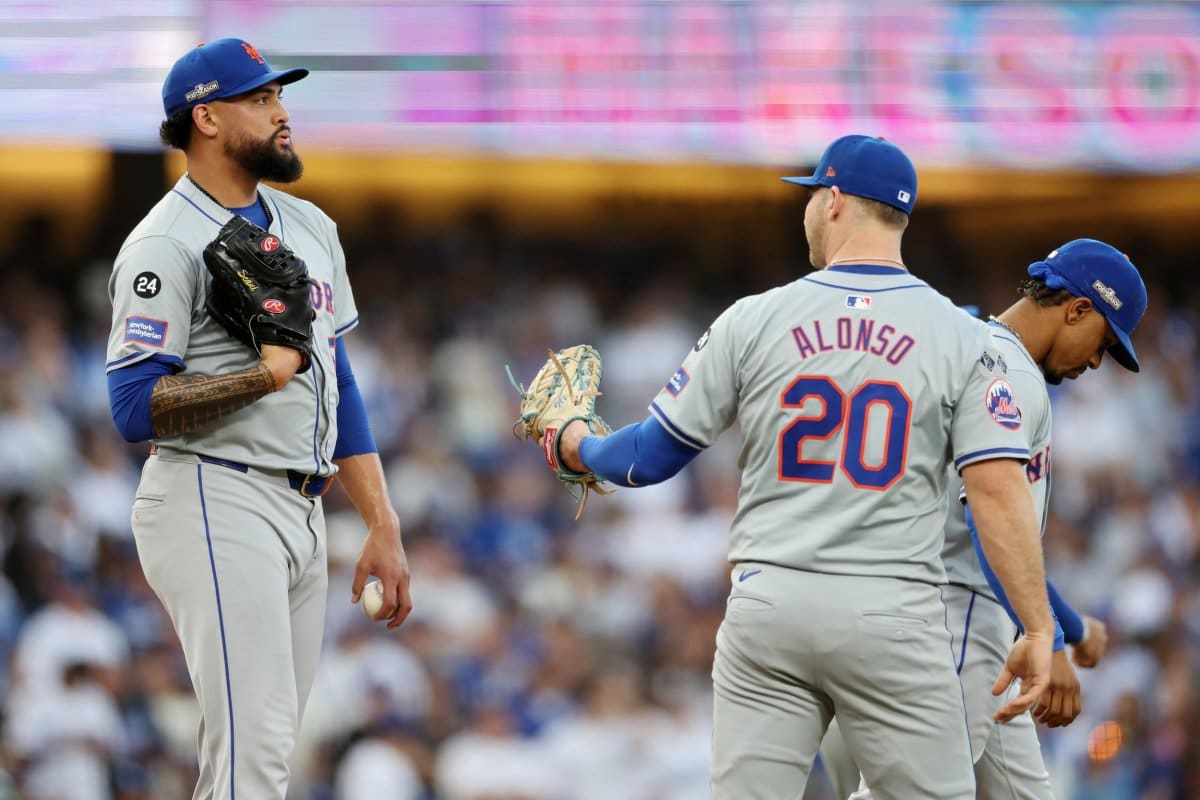 LOS ANGELES, CALIFORNIA – OCTOBER 20: Sean Manaea #59 of the New York Mets reacts after a mound conference during Game Six of the National League Championship Series against the Los Angeles Dodgers at Dodger Stadium on October 20, 2024 in Los Angeles, California.