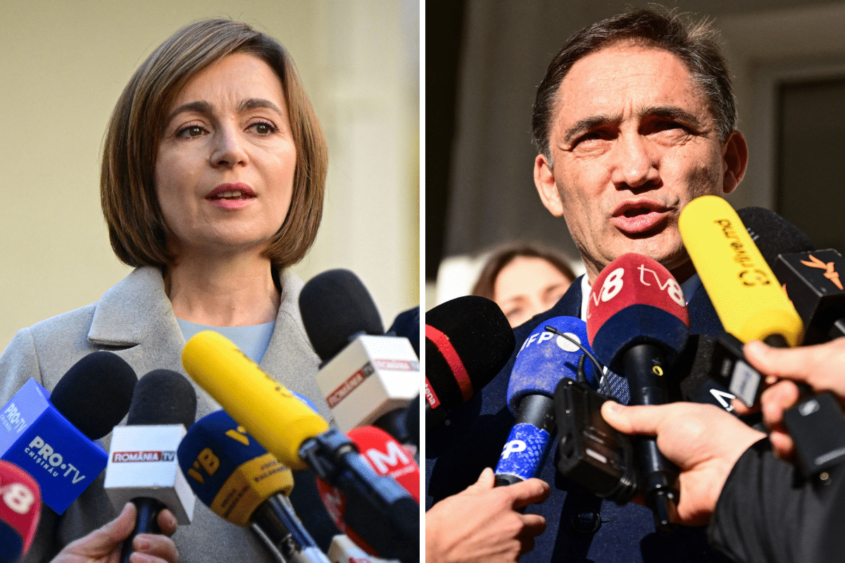 Left, Current Moldova’s President and candidate Maia Sandu addresses media after she casted her vote for the presidential election at a polling station in Chisinau November 3, 2024. Moldova’s pro-EU President Maia Sandu is facing Alexandr Stoianoglo, whom she fired as prosecutor general in 2023, in a tense presidential election on November 3, 2024. The vote is seen as key to determining whether the ex-Soviet republic sandwiched between Ukraine and as the EU will continue on a pro-European path, with fears of Russian interference looming large. Right, Moldova Presidential candidate Aleksandr Stoianoglo addresses media after he casted his vote for the presidential election in Chisinau November 3, 2024.