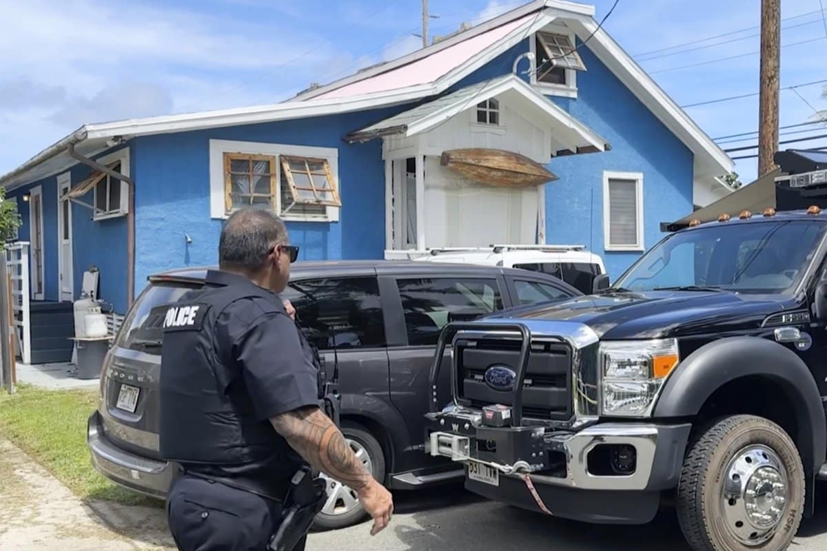 A police officer walks by the home of Ryan Routh, the man accused of an apparent attempt to assassinate Donald Trump, while FBI agents conduct a search inside, Tuesday, Sept. 17, 2024, Kaaawa, Hawaii.