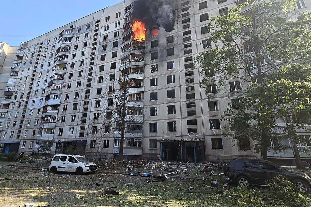 Flames rise and debris is scattered on the ground after a Russian aerial bomb struck a multi-story residential building in Kharkiv, Ukraine, on September 15. Over 30 Ukrainian civilians were injured on Sunday after Russia launched an air strike on a high-rise in Kharkiv, the war-torn nation’s second-largest city, according to local officials.