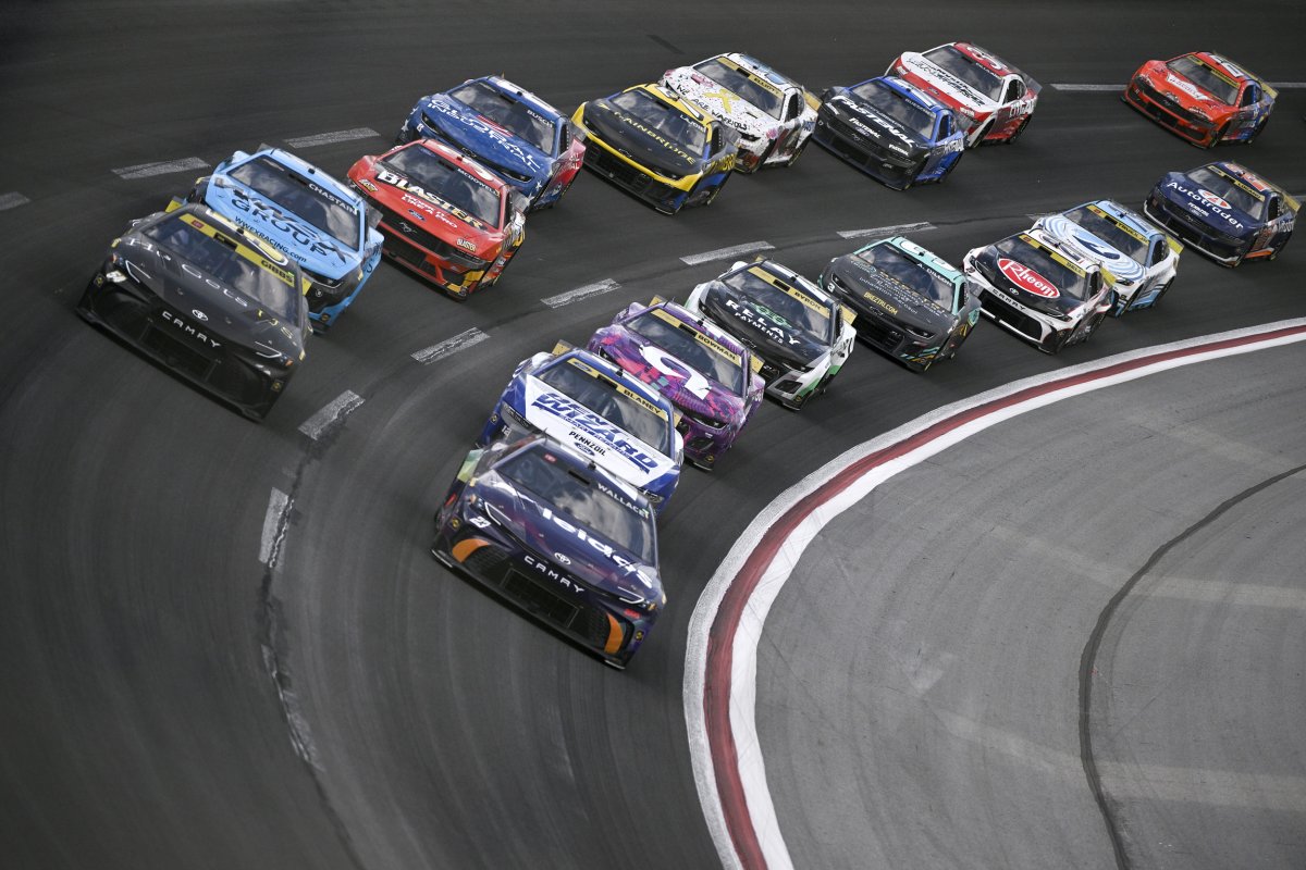 Ty Gibbs, driver of the #54 He Gets Us Toyota, and Bubba Wallace, driver of the #23 Leidos Toyota, lead the field during the NASCAR Cup Series Quaker State 400 Available at Walmart at Atlanta Motor Speedway on September 08, 2024 in Hampton, Georgia. Two IndyCar drivers eye a spot in NASCAR.